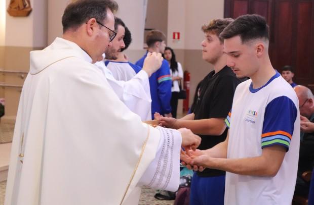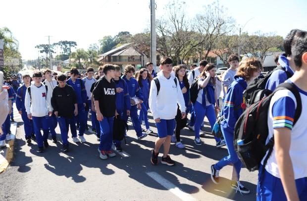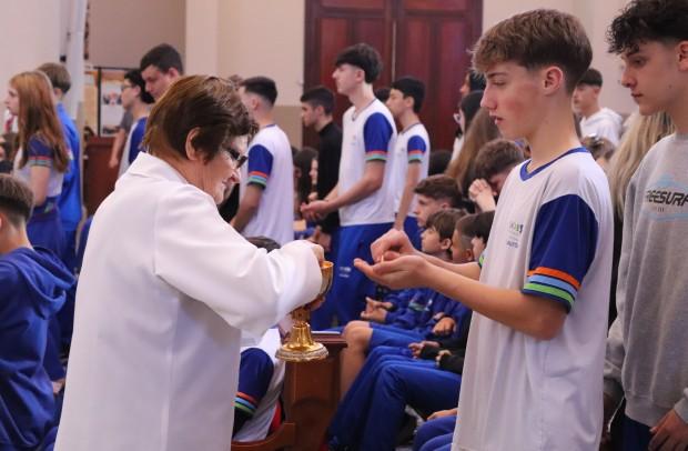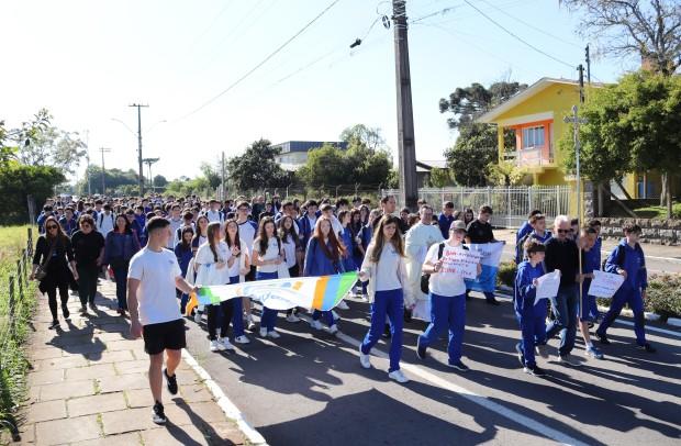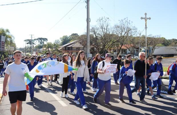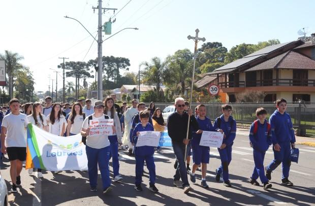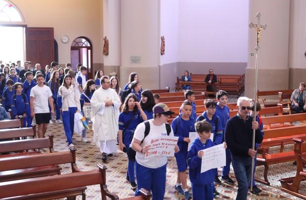 Estudantes do Colégio Scalabriniano Nossa Senhora de Lourdes e da Escola Municipal Nossa Senhora de Caravaggio participaram do encontro, que iniciou com a caminhada pela avenida Dom José Barea e teve como ponto alto da Missa no Santuário